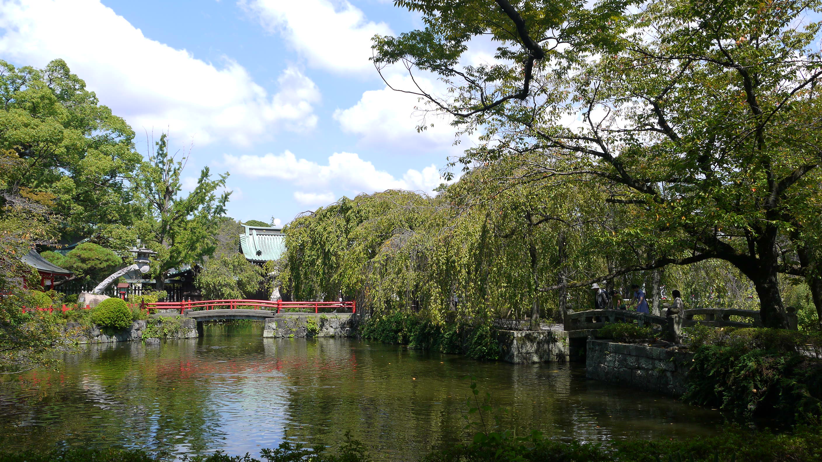 大鳥居をくぐると、参道の両側には「神池」(写真下)にかかる形で枝垂れ桜が植わっています。