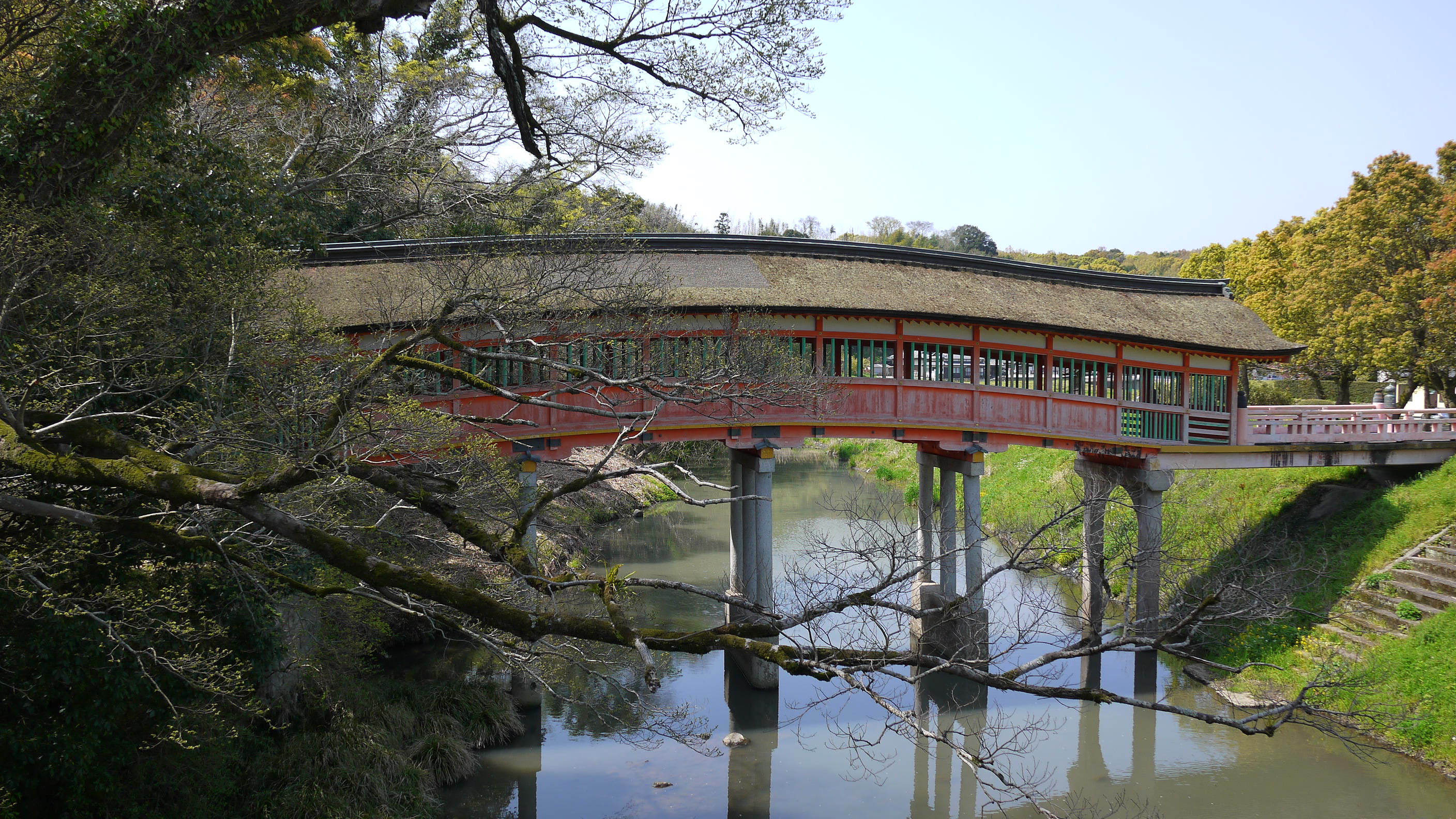 上の写真は、境内を囲むように流れる寄藻川にかかる『呉橋』と呼ばれる神橋です。鎌倉時代以前に、呉の国から来た人が建てたと言われる屋根のついた橋で、こ