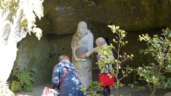 弁天窟の手前には、愛くるしい大きなこけしのような“和み地蔵”がたたずんでいます。