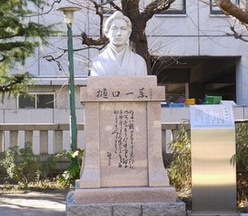 境内左手には、一葉の胸像が建立されていて、下部にある碑文には「明日ハ鎮守